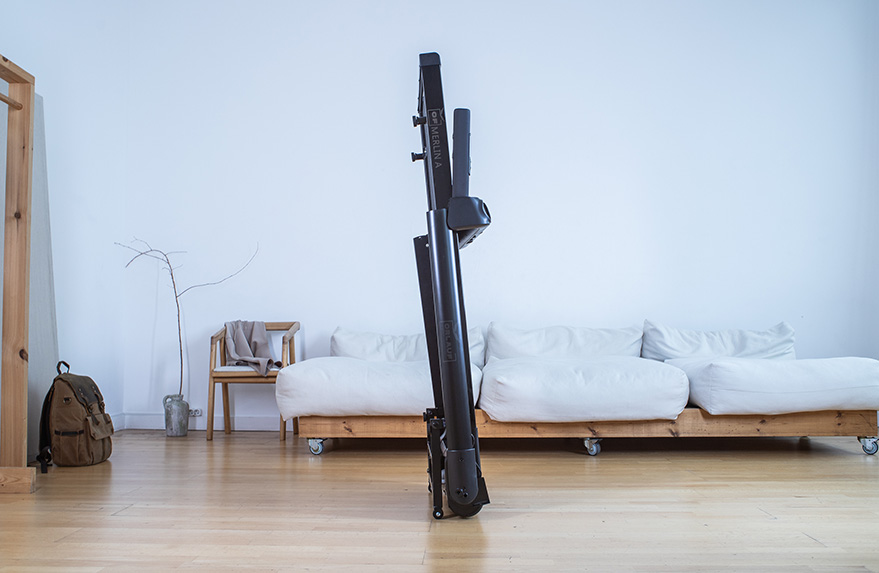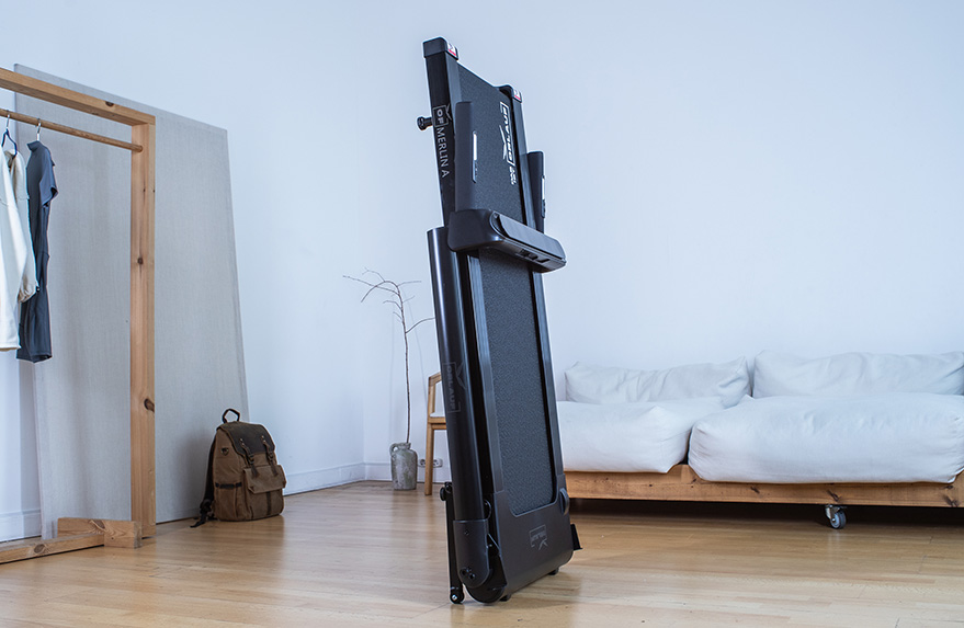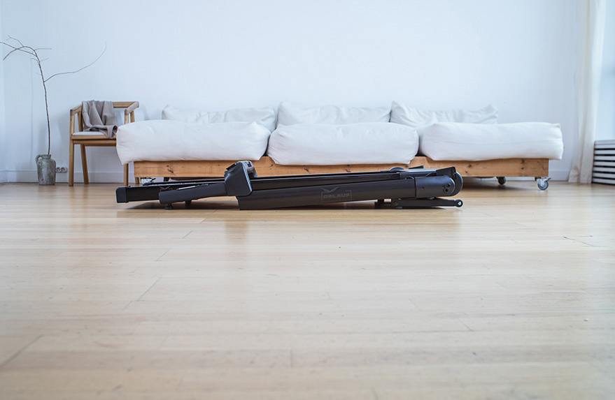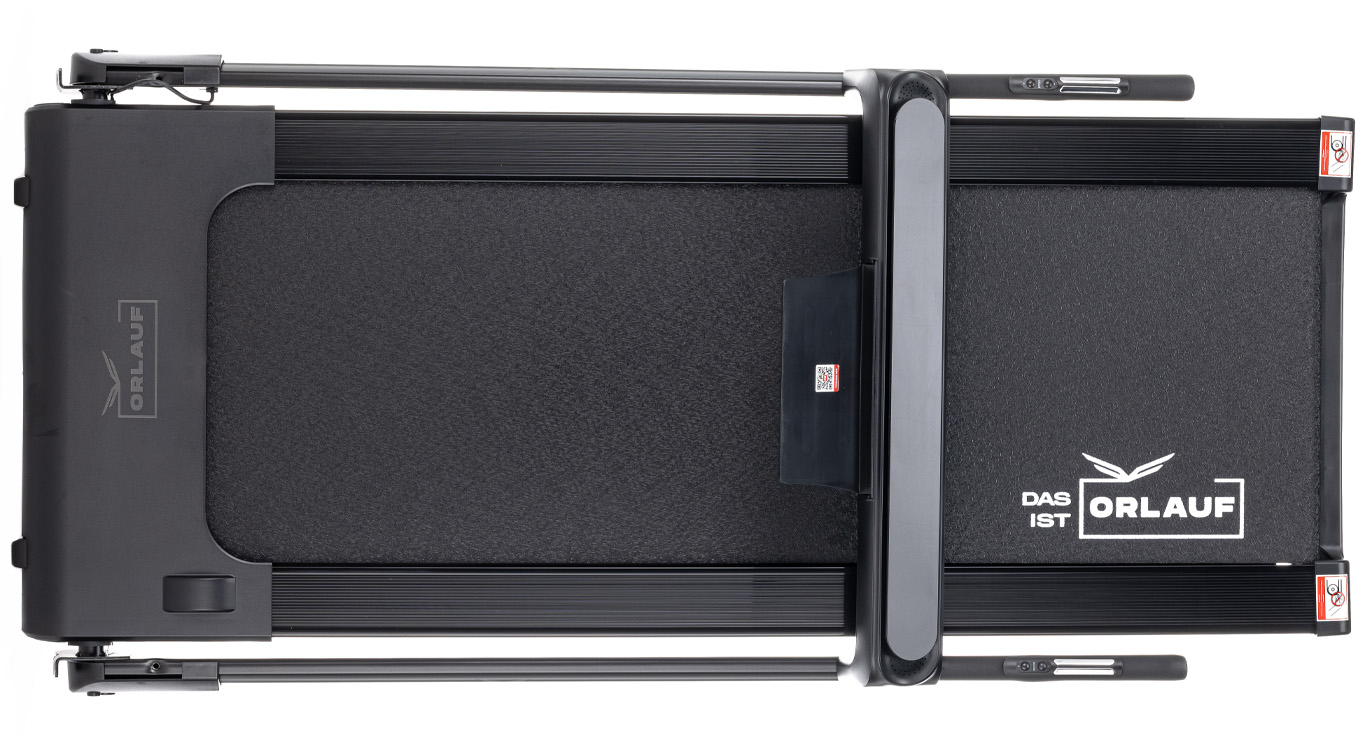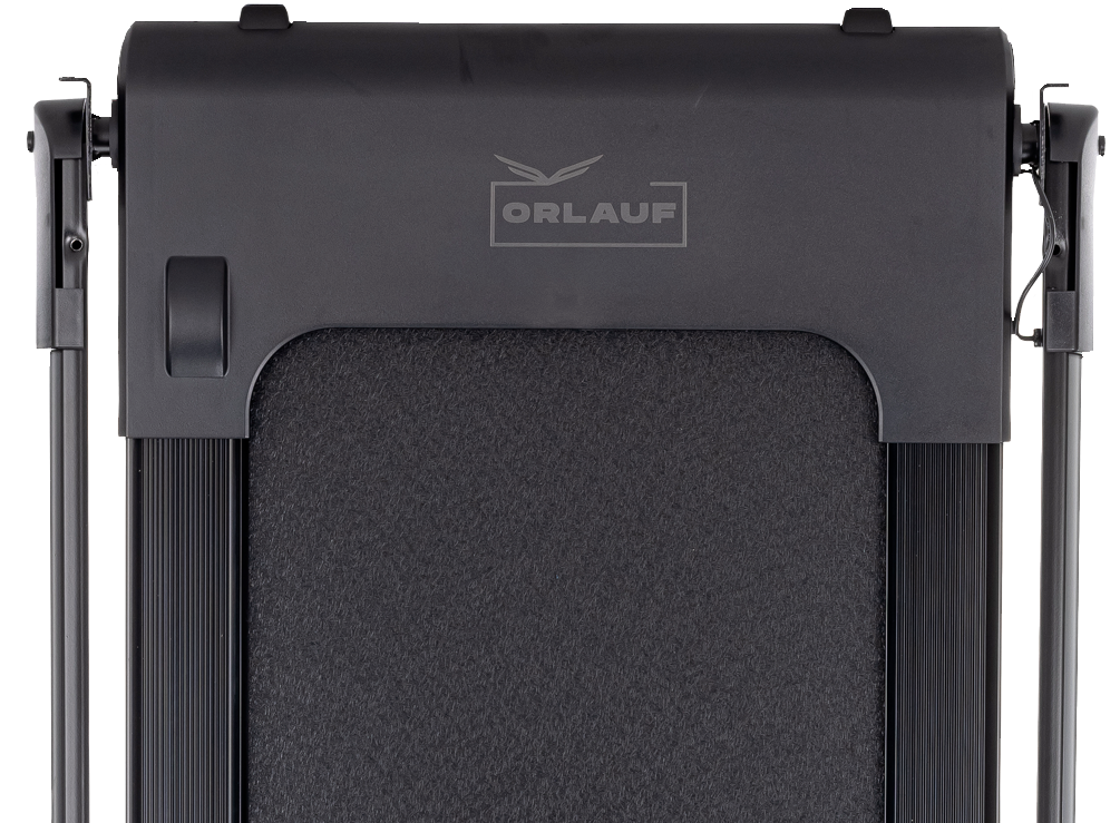 Orlauf Merlin A отличается ультракомпактными размерами и удобной системой складывания, что позволяет легко складывать дорожку одним движением. В сложенном виде толщина составляет всего 22 см. Благодаря выдвижной подножке дорожку можно хранить как горизонтально, так и вертикально.