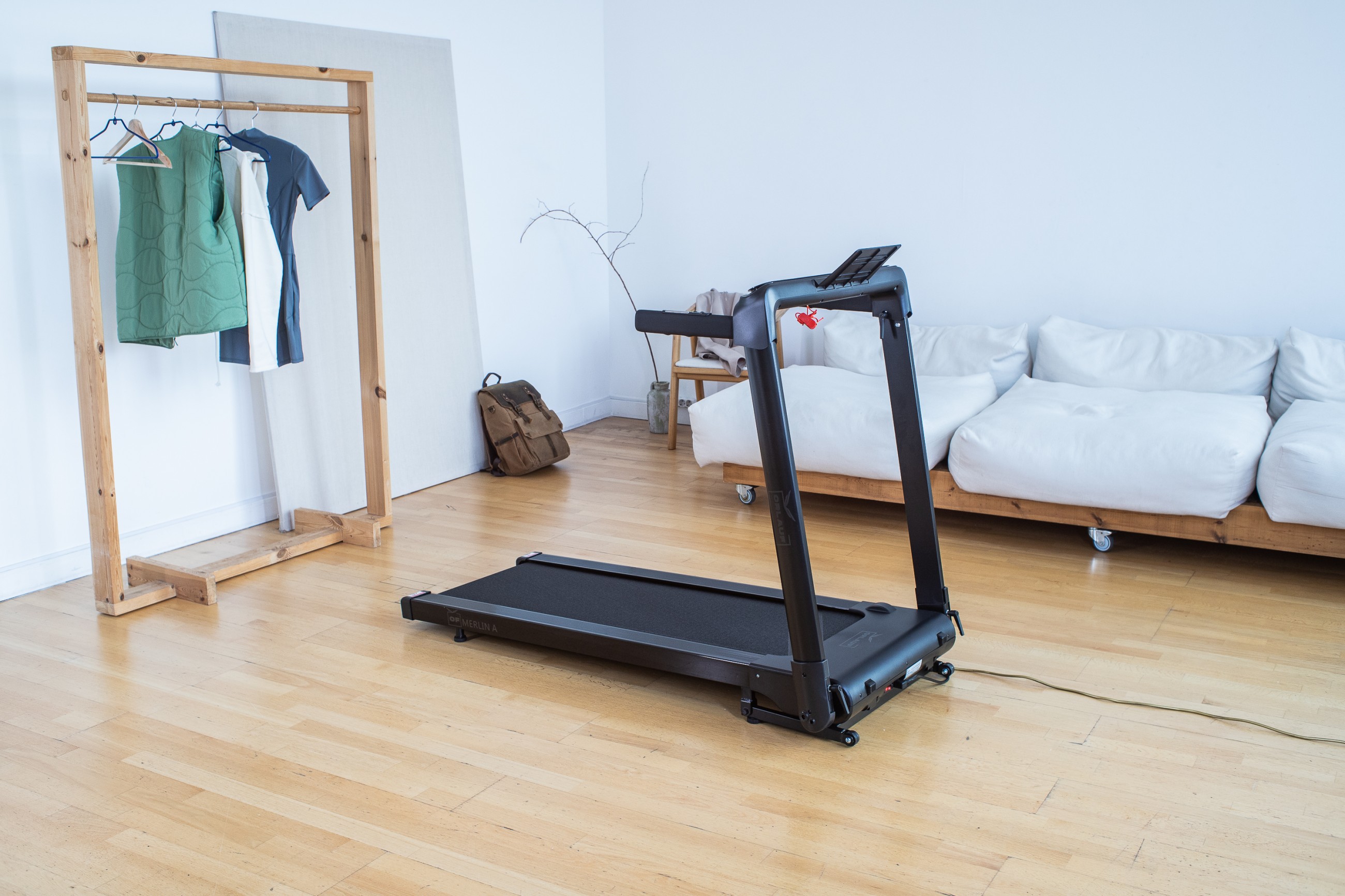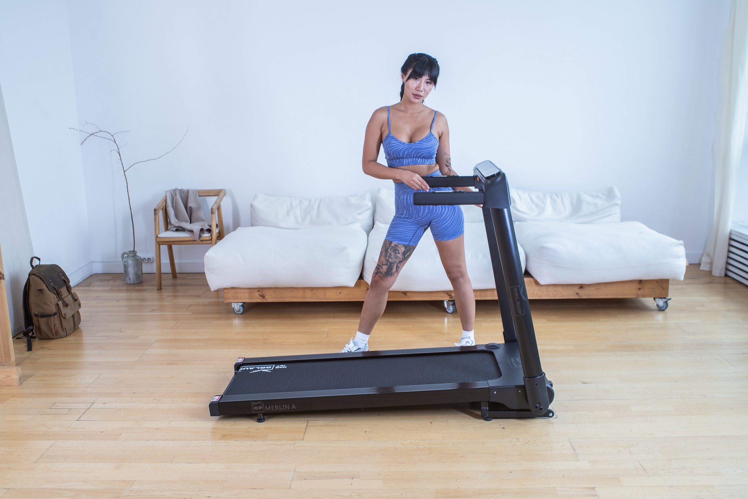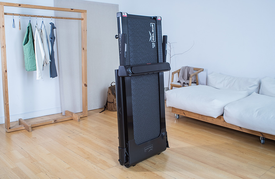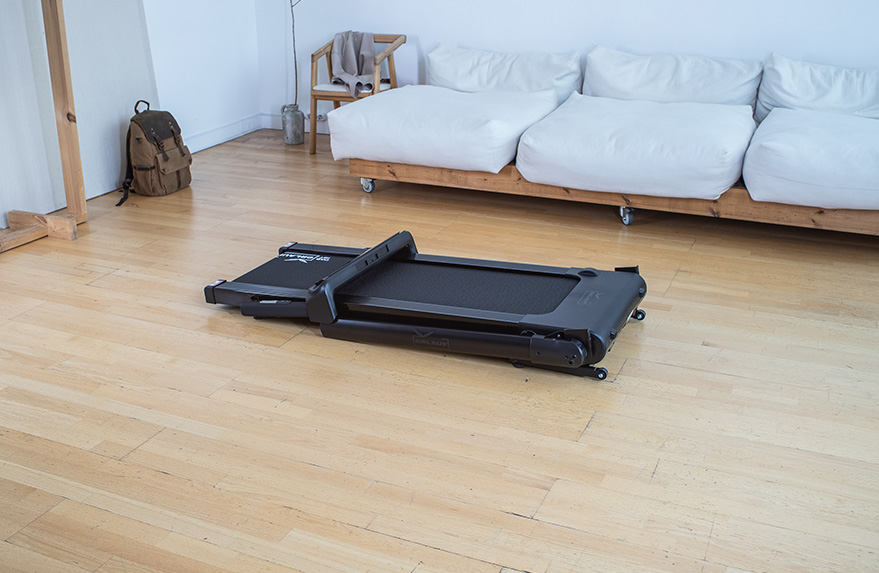 Orlauf Merlin A отличается ультракомпактными размерами и удобной системой складывания, что позволяет легко складывать дорожку одним движением. В сложенном виде толщина составляет всего 22 см. Благодаря выдвижной подножке дорожку можно хранить как горизонтально, так и вертикально.