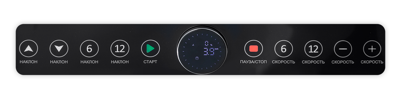 Помимо кнопок регулировок, по центру расположена кнопка с дисплеем, на который выводятся все показатели тренировки. С помощью кнопки можно включать и ставить тренировку на паузу, а также регулировать скорость.